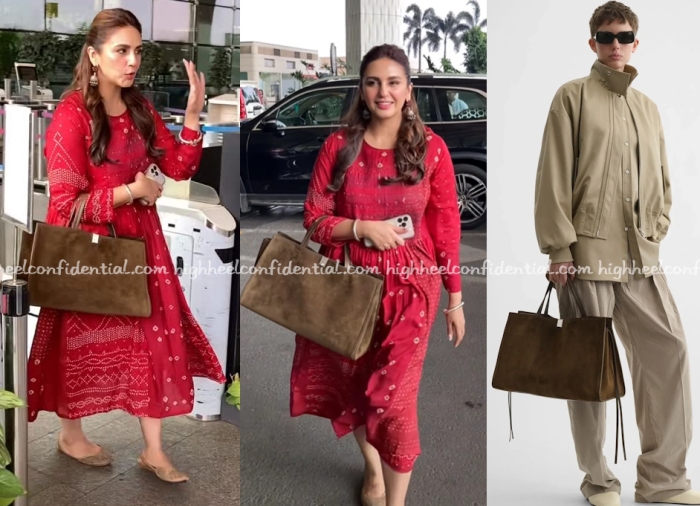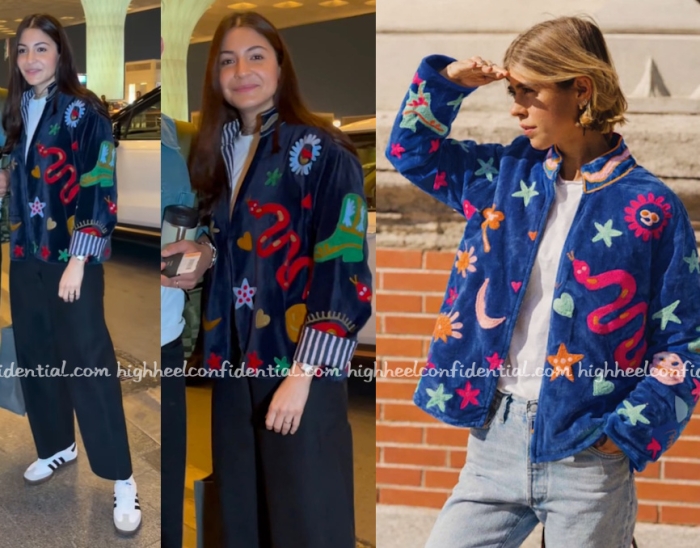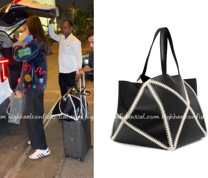 Anushka travelled out of the city early Sunday morning and was spotted keeping it casual in denims, tee and a Suzani embroidery jacket from The Jaipur Collective. The jacket sure was striking. Yet again, what caught my eye though was the tote she had in hand but the Nanushka origami tote that was settled on their carryon.