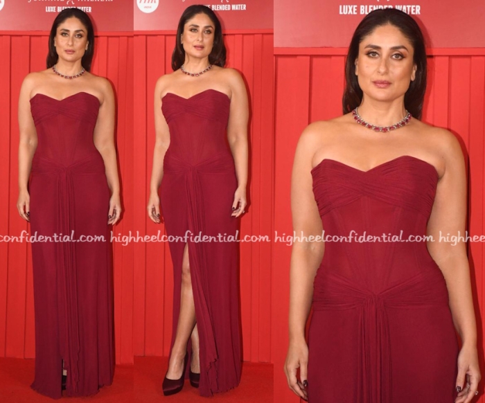 Kareena attended an event on Wednesday evening wearing a vintage gown from Vicky Tiel paired with a ruby necklace and her hair down. I like the idea of keeping it simple but I feel like the gown needed a different hair do.