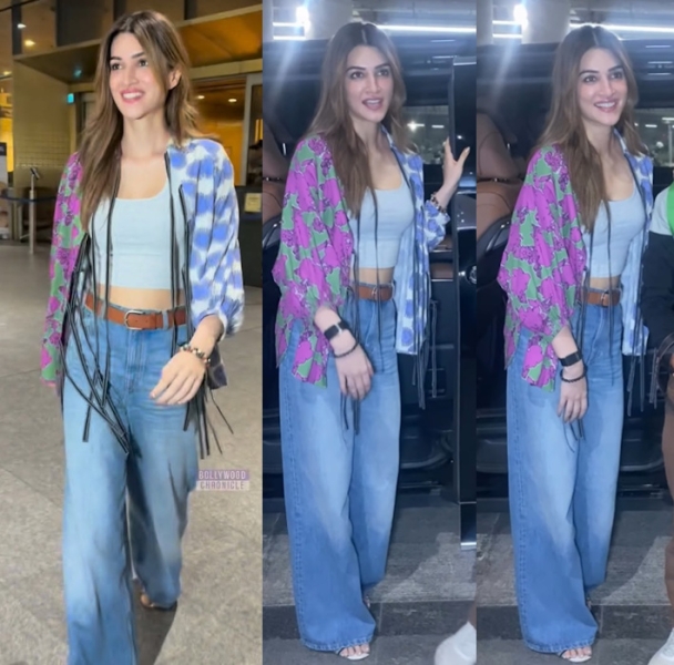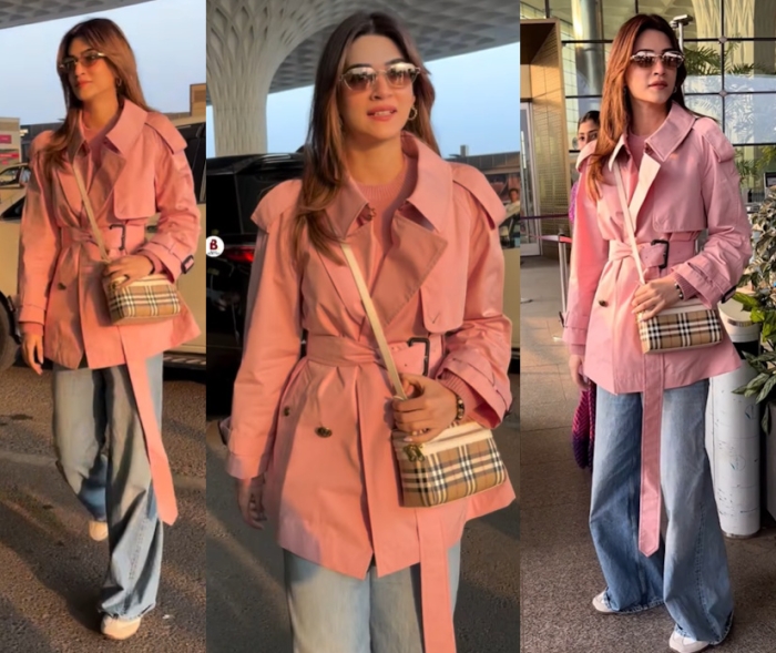 Kriti was seen travelling this past week in denims, first worn with a grey cropped tank and a printed Dhruv Kapoor shirt and then in a pink Burberry trench, sweater and Burberry bag.