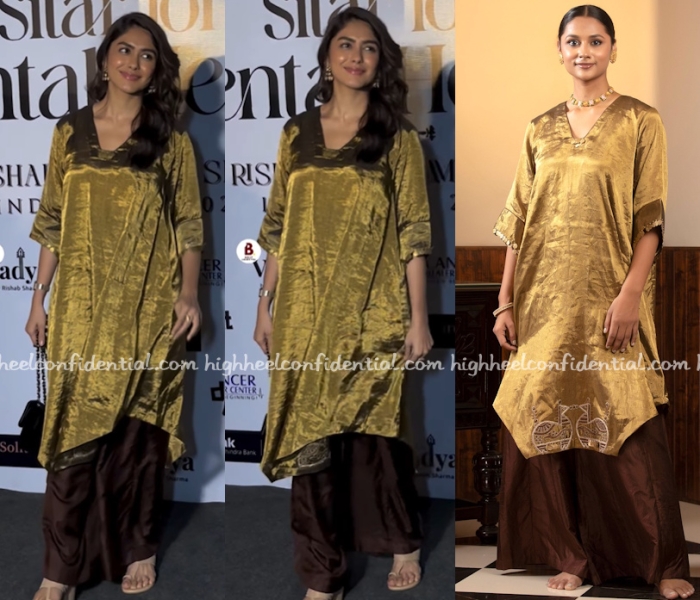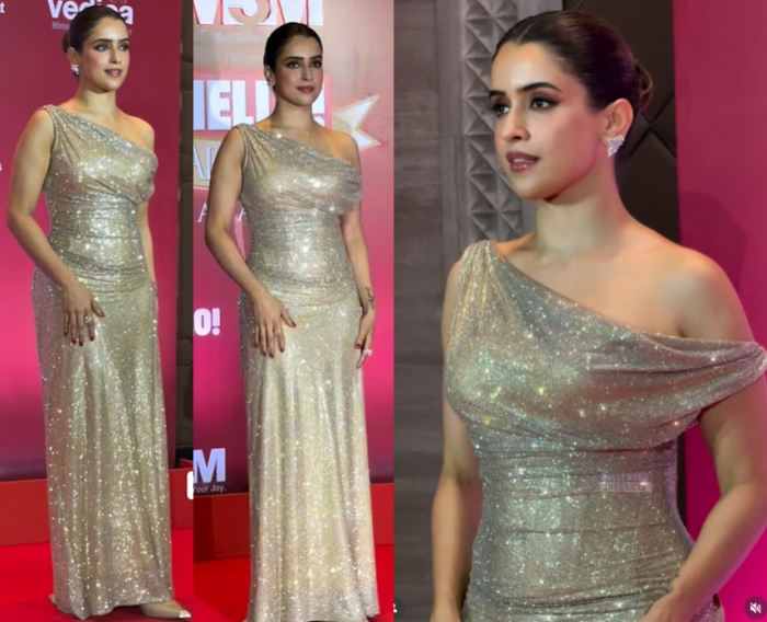 Sanya was seen at an awards event on Sunday evening in an off-shoulder gold glittery gown from Itrh featuring their signature rhinestone fabric. Hair in an updo, her look was finished out with diamond earrings and sparkly toed pumps. I would’ve preferred sandals here but she looked good nevertheless.
