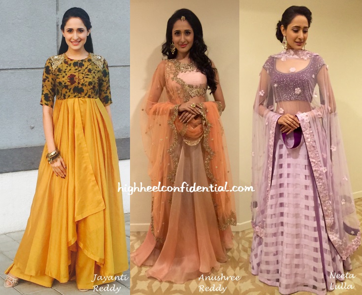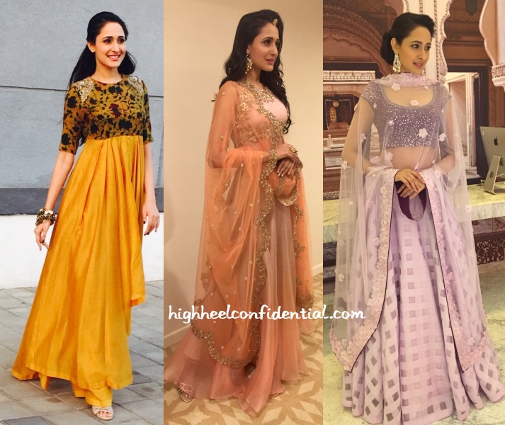 At a recent wedding celebration, Pragya was seen in a Jayanti Reddy anarkali at the mehendi, an Anushree Reddy lehenga at the sangeet and a Neeta Lulla lehenga at the reception.
