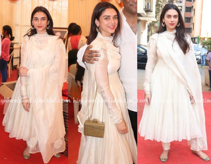 Wearing a white anarkali featuring chikankari work, Aditi dropped by director Anurag Basu’s Saraswati Puja celebrations. Chaand hoop earrings, a gold box shoulder bag and printed jootis finished out her look.