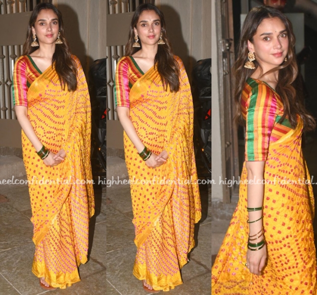 Wearing a yellow bandhani sari with a mashru stripe blouse, Aditi attended a Diwali party on Monday evening. She looked absolutely lovely in it.