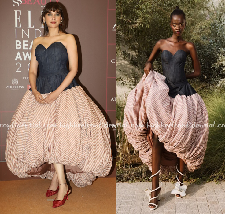 Aditi wore a strapless dress from AFEW Rahul Mishra to a beauty awards paired with ruby red slingbacks. The dress itself was a whimsical one with its OTT bubble skirt and while I liked that she took the risk, am on the fence whether it was a good move. The silhouette looked overwhelming on her.