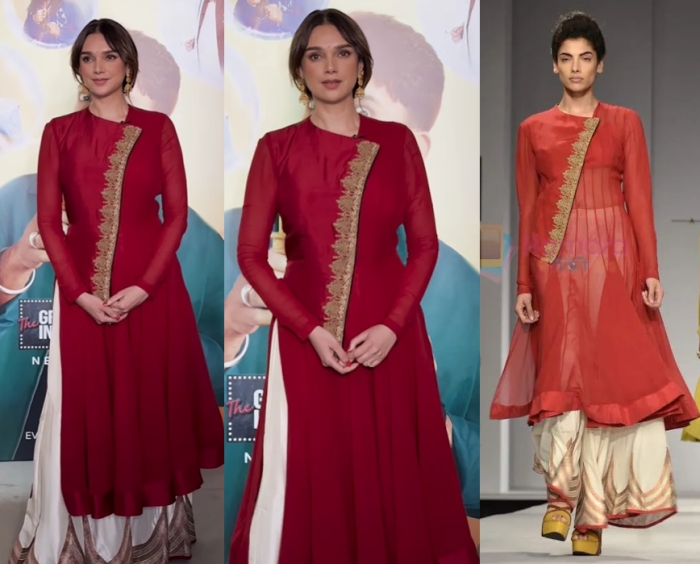 Aditi attended the taping of a show wearing a sharara from Anand Kabra, which was a modified version of the one he showed in his 2013 collection. In fact, we’ve seen the original version on this celeb here as well.