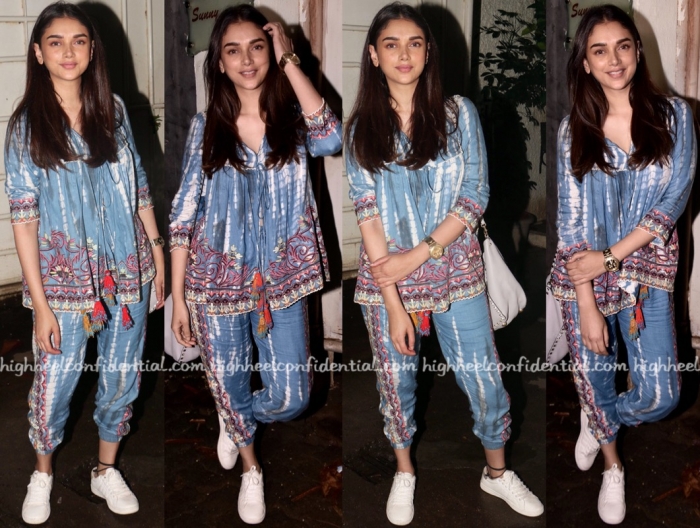 At a recent movie screening, Aditi was photographed in Hemant and Nandita. Keeping things casual, she rounded out the look with barely there make-up, a shoulder bag and pair of sneakers.