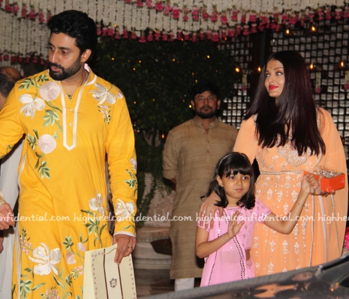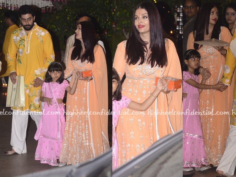 Aishwarya looks lovely. Not because of the outfit, obviously. Kiddo looks too cute in pink. Abishek, not sure why he does this to himself?