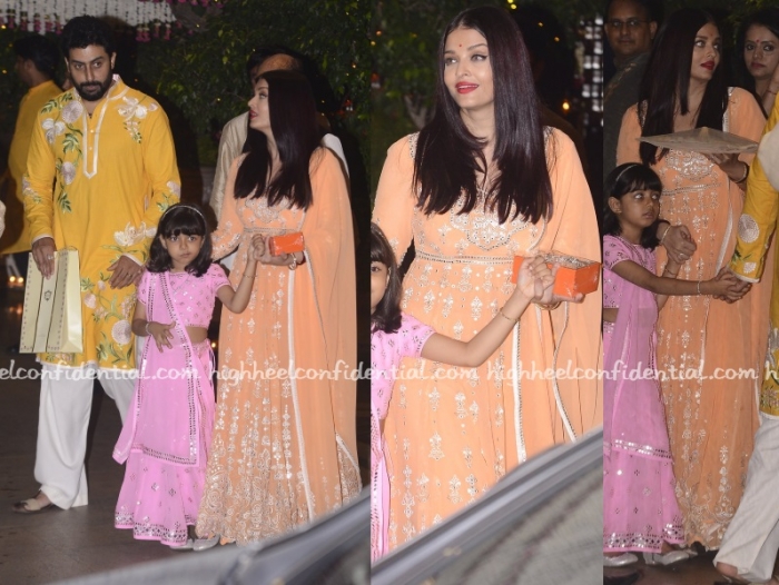 Abhishek and Aishwariya look okay; but little Aradhya looks cute. Wish Aishwarya would have chosen a saree for one. Major gripe..the red lipstick, which seems to be only lip color she has available and it looks horrendous with peach.