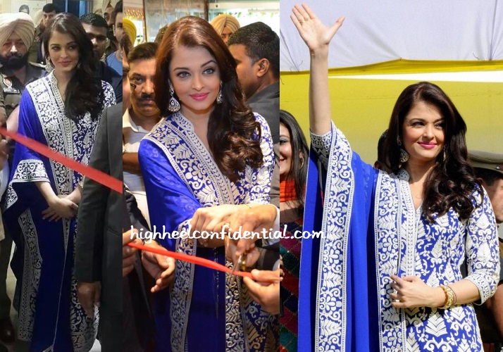 For the insuguration of Kalyan Jeweller stores in Punjab, Aishwarya revisited the same color scheme as her Kerala trip wearing a navy Abu Jani Sandeep Khosla kurta suit with pink lips.