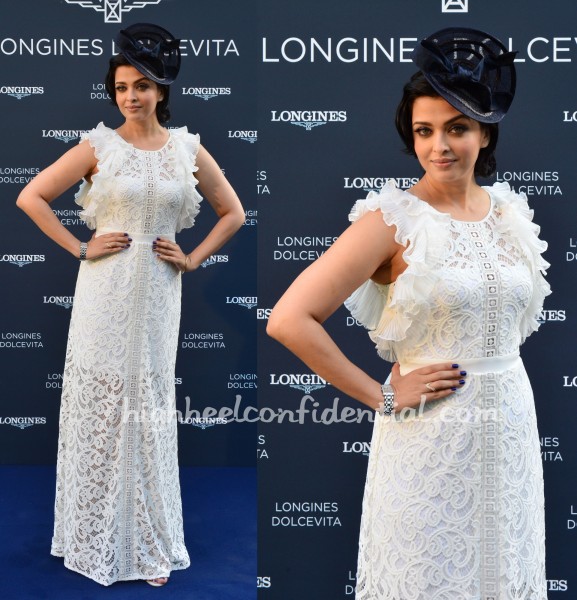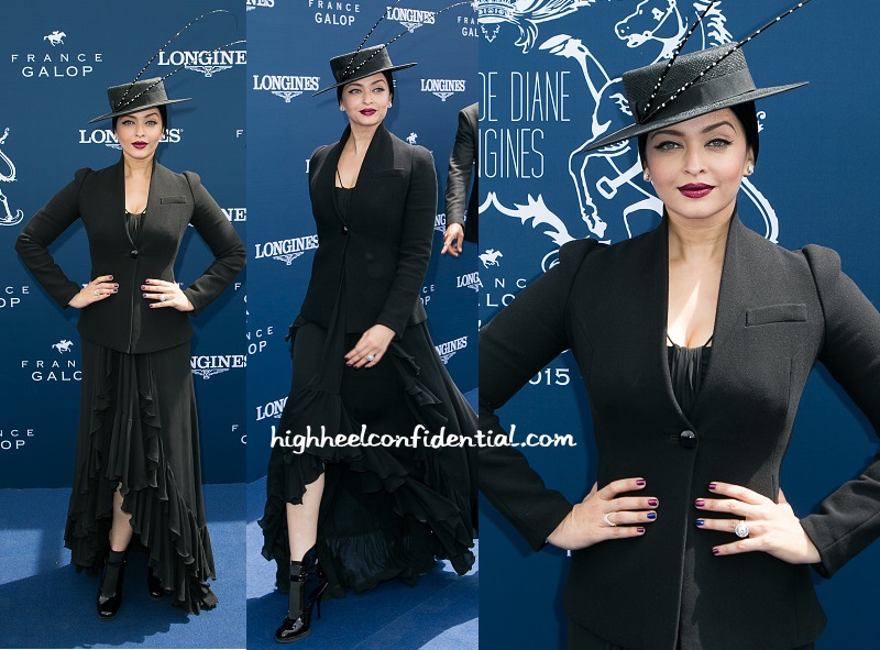 As Longines’ ambassador, Aishwarya made an appearance today at the Prix De Diane Longines and a garden party on Saturday evening. While we liked the garden party look (in a BCBG maxi), can’t seem to figure out why Ash would say yes to the black one.