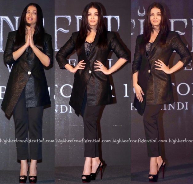 Aishwarya, who lends her voice to the hindi-dubbed version of the film, ‘Maleficent: Mistress Of Evil’, stepped out in an all-black look at its trailer launch back in October of last year. Teaming the asymmetrical jacquard jacket with cigarette pants and Christian Louboutin slingbacks, the actor finished out the look with her signature centre-parted poker-straight hair do.