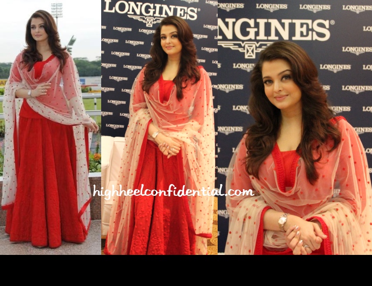 As brand ambassador of Longines, Aishwarya made an appearance at the Singapore Gold Cup races today wearing a red Sabyasachi lehenga from the designer’s couture collection.