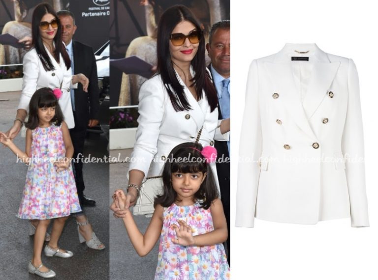 While stepping out of her hotel, Aishwarya was spotted wearing a Versace double breasted blazer with denims, a white Dior Diorama bag and ankle-strap sandals.