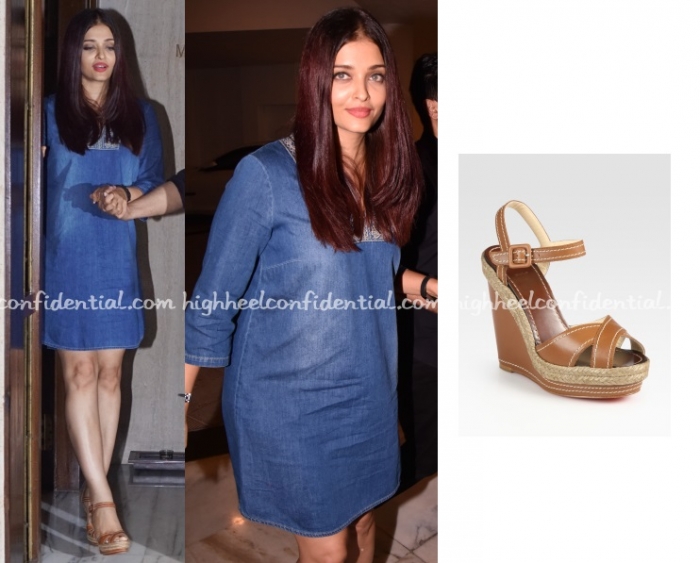 Wearing a simple denim shift dress with tan Louboutin wedges, Aishwarya attended a dinner at Manish Malhotra’s house on Tuesday evening. A look you’d wear? We’d probably add a scarf to give the look more depth but do like the simplicity of it.