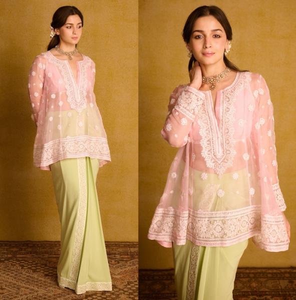 Perhaps, Rhea tried to put a “painting-like” look which with the background, photography and filters can be created however, without that, the look lacks any impact. Short Chikan kurtis – even in fabrics like georgette pair so well with nicely-flared crushed skirts. That kind of an ensemble then combined with Alia’s makeup and hair would have looked dreamy. As is, it looks like another attempt at trying to be different.