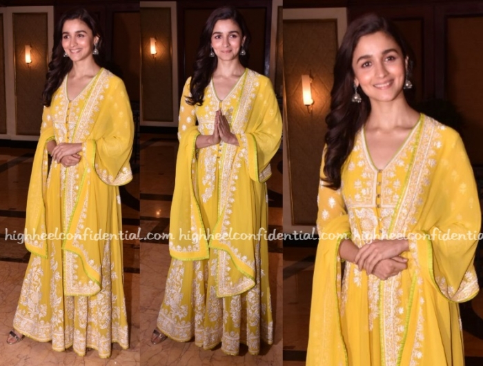 At the success meet of Raazi, it was a cheery Abu Jani Sandeep Khosla floor length anarkali for Ms. Bhatt, one that she wore with silver jhumkis and silver sandals.