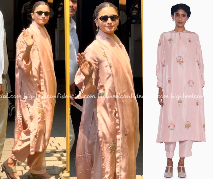Alia travelled to Chennai on Thursday for an event and was seen wearing an Anavila embroidered kurta set with Aprajita Toor kolhapuri sandals and jhumkis. Like the suit?