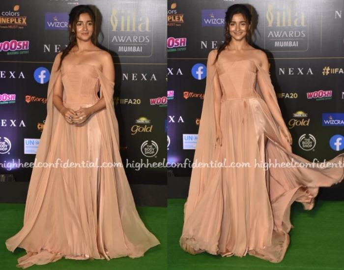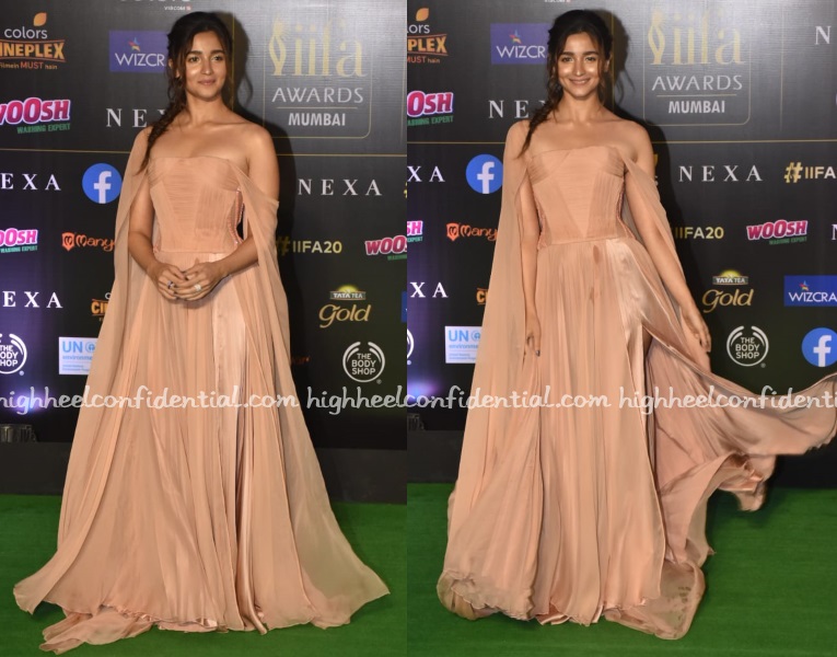 Alia made an appearance at IIFA Awards wearing a peach-pink gown by Georges Chakra with a messy braid. The hairdo sure made for a welcome change but I found the look a bit too one-toned. Also the highlighter on the cheeks felt a bit excessive.