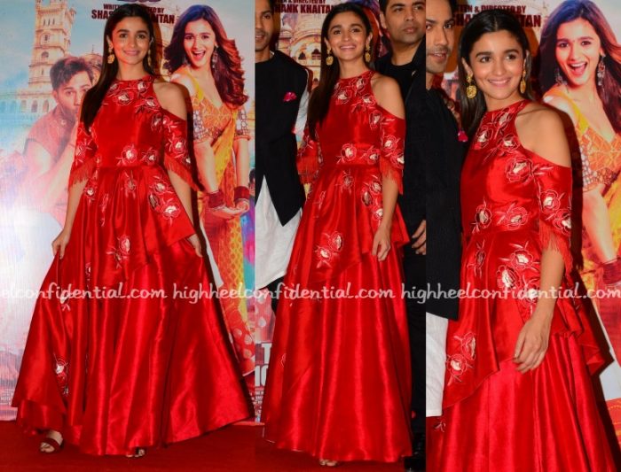 At the trailer unveiling of her movie, Badrinath ki Dulhania, Alia was seen in a red Manish Malhotra gown featuring a cold shoulder and fringe sleeves.