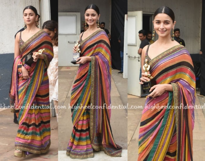 Alia attended the Star Screen Awards on Sunday wearing a striped Sabyasachi sari. She also wore a green polka dotted suit by the designer on Saturday evening to a wedding. Alas, while I love the sari and the suit, I wish she hadn’t sported the same Sabyasachi signature finishing touches with both.