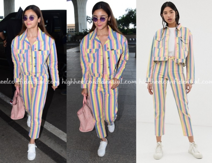 Wearing striped co-ords from Wrangler, Alia jetted out of Mumbai on Monday morning. I like the jacket on the model but on Alia, it felt too boxy and ended up looking more comical than cool. The pink tank also didn’t help. Just me feeling that way?