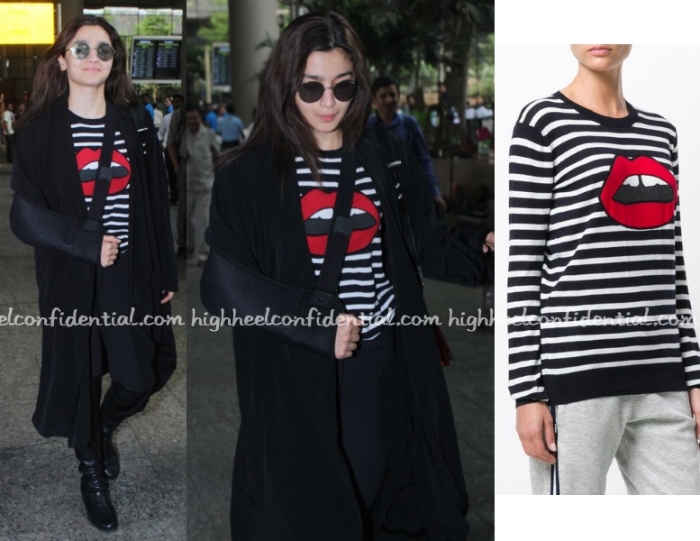 Back from Bulgaria after completing the first schedule of Brahmastra, Alia was spotted arriving in Mumbai on Monday wearing a Marcus Lupfer striped jumper.