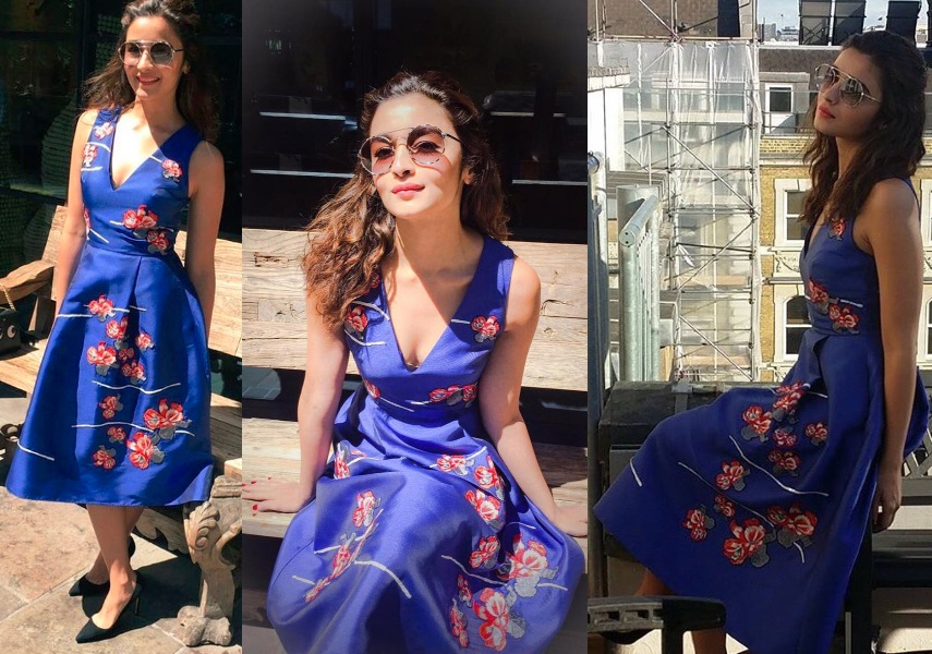 In London on vacation, Alia attended a press meet to promote her upcoming concert on Wednesday wearing a blue Sachin and Babi dress. Hair in soft curls, her look was finished out with lack pumps.
