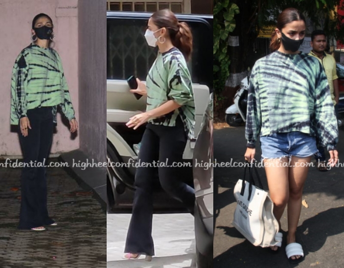 Alia was spotted wearing her Electric & Rose tie-dye sweatshirt again, this time with black flared denims. It was good to see her do so.