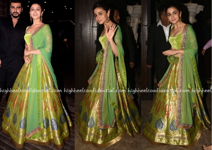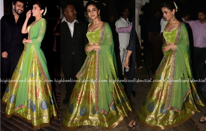 Wearing a Manish Malhotra brocade lehenga, Alia attended a diwali party, this time at Anil Kapoor’s. With flowers in her hair, a pair of traditional earrings is all that it took to round out the actor’s look.