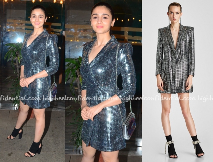 That’s too much bling for my taste but youth by her side n subtle makeup is helping her to carry-off the look. Footwear not going with the dress. Simple grey/blue tinted pumps or even sandals would have worked!