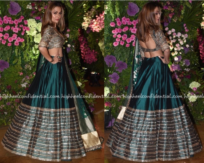 For a recent wedding in Mumbai, Amrita picked a Manish Malhotra lehenga to wear. Considering it was not the usual pastel sparkly number from the designer, it made for a welcome change. But we aren’t convinced the lehenga itself worked on Amrita. The dupatta seemed to overpower her and the styling overall seemed too severe. It was bit of a miss!