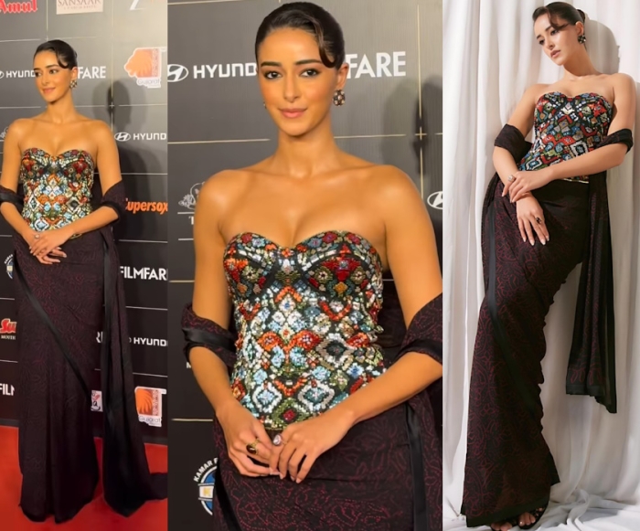 Ananya attended the Filmare Awards wearing a bandhani sari featuring a bustier with sequins in a patola-inspired pattern from Abu Jani Sandeep Khosla. The pick was an ode to Gujarat’s craft (where the awards were held) and I thought it was incorporated well without looking gimmicky. She looked good.