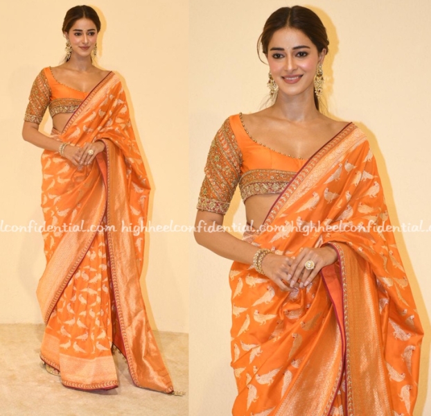 Ananya wore an orange benarasi sari from Swadesh paired with an embellished blouse from Manish Malhotra. This would’ve been a great look if not for the blouse. Adding that border on the cups was so unnecessary.