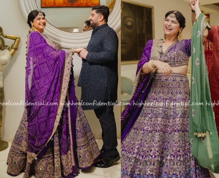 Anshula and Rohan got engaged this past week and in attendance were all her cousins and other family members. Anshula wore an Arpita Mehta purple lehenga.