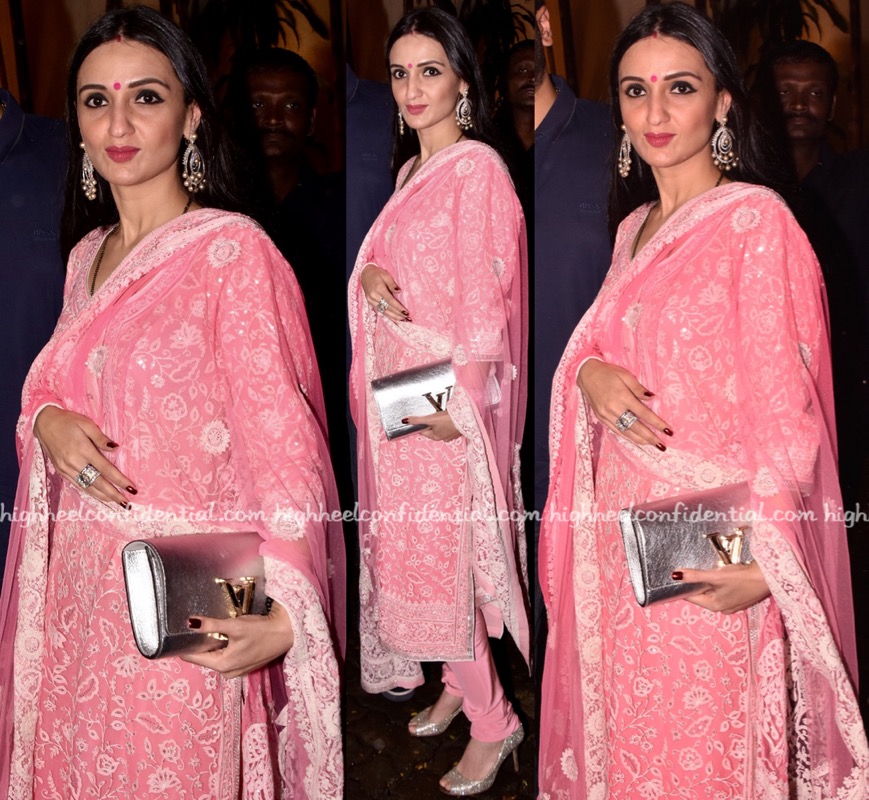 Wearing an Abu Jani Sandeep Khosla suit, Anu partook in festivities at Sunita Kapoor’s home. A matching pink bindi, sparkly pumps and a metallic Louis Vuitton clutch rounded out her look.