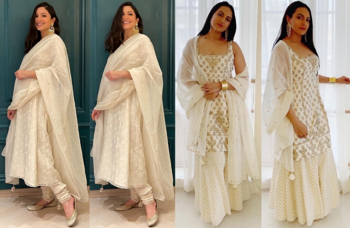 Recent round of festivities had both Anushka and Sonakshi picking Anita Dongre to wear. Among their choice of accessories, statement-y earrings that they both rounded out their looks with. As nice as they both looked, I am partial to Anushka’s look here… Much prefer the suit on her and besides, she looked positively radiant!