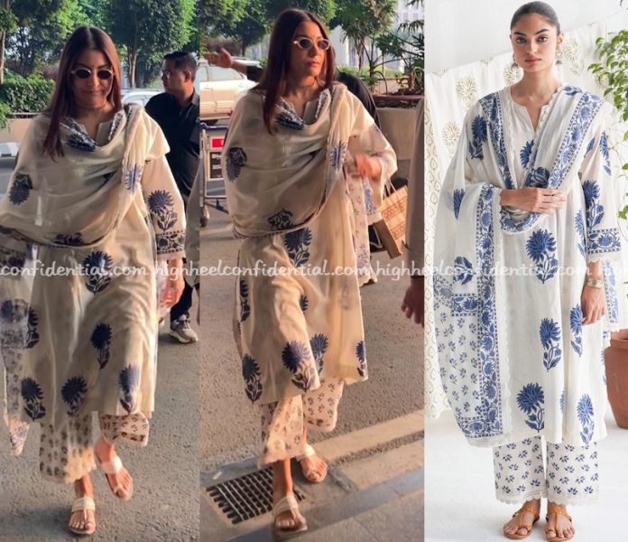 Anushka travelled out of Mumbai early Monday and was seen wearing a cotton block print kurta set from Ridhiiee Suuri paired with Aprajita Toor kolhapuri chappals. Simple and fuss free.
