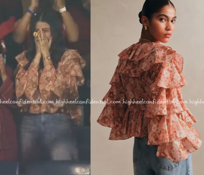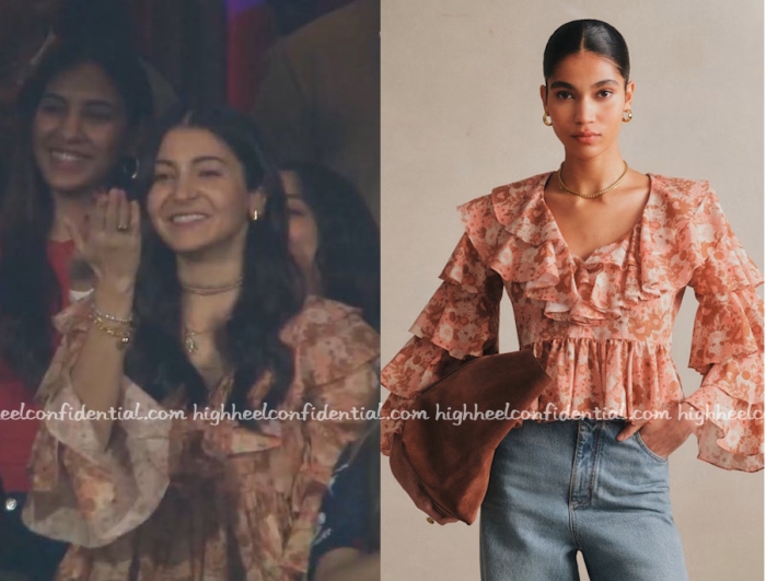 Anushka was spotted the opening match of IPL 2026 played between RCB and SRH wearing a Sézane ruffle top. Shop the top below.