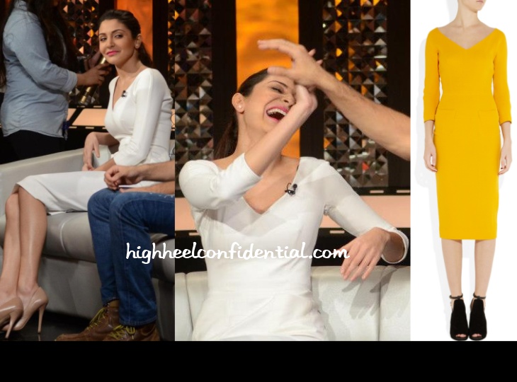 Anushka makes an appearance in a classic Victoria Beckham sheath on The Front Row this Fri. A white dress and you may think a bold lip but the light pink lips and nude pumps work rather well.