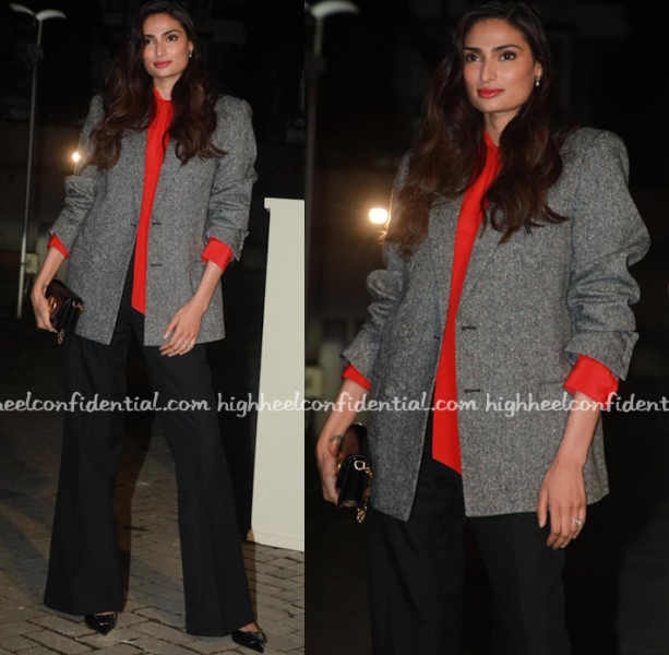 Athiya attended a dinner hosted by Valentino wearing a grey blazer with black pants and a red top, all from the label. I liked that she layered the red with the grey toning the color down a bit. I liked.