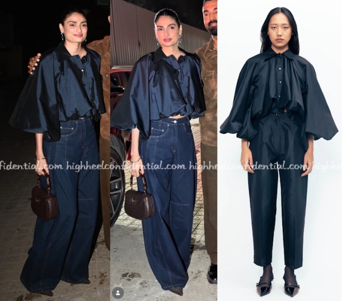 Athiya lent her support to her brother at his movie’s screening and was spotted wearing a Lovebirds jacket/top with dark wash denims, pointed pumps and her Gucci Bamboo 1974 bag. Given how flouncy that top is, it wouldn’t be my first pick to sport but she sure looked great in it!