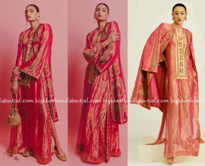Athiya attended a wedding recently wearing a Masaba kaftan and jacket set with jewellery also from her line and a potli from Fizzy Goblet. The set sure was striking with its metallic tissue fabric and gold embroidery. I am curious however, how the kaftan looks in real life with its lining only up to the hips.
