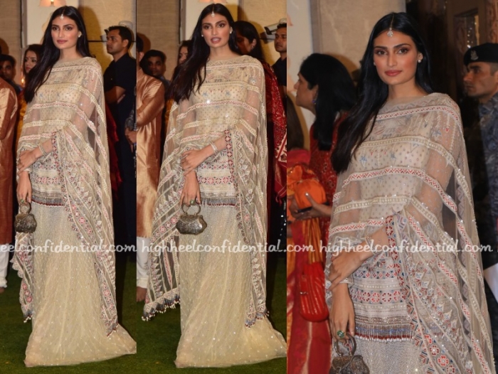 At the Ambani Ganesh Chaturthi celebrations, Athiya was seen in a Tarun Tahiliani sharara paired with a silver bag and a dainty maang tikka. Maang tikkas, most times on these pages, have broken a look. That wasn’t the case here.