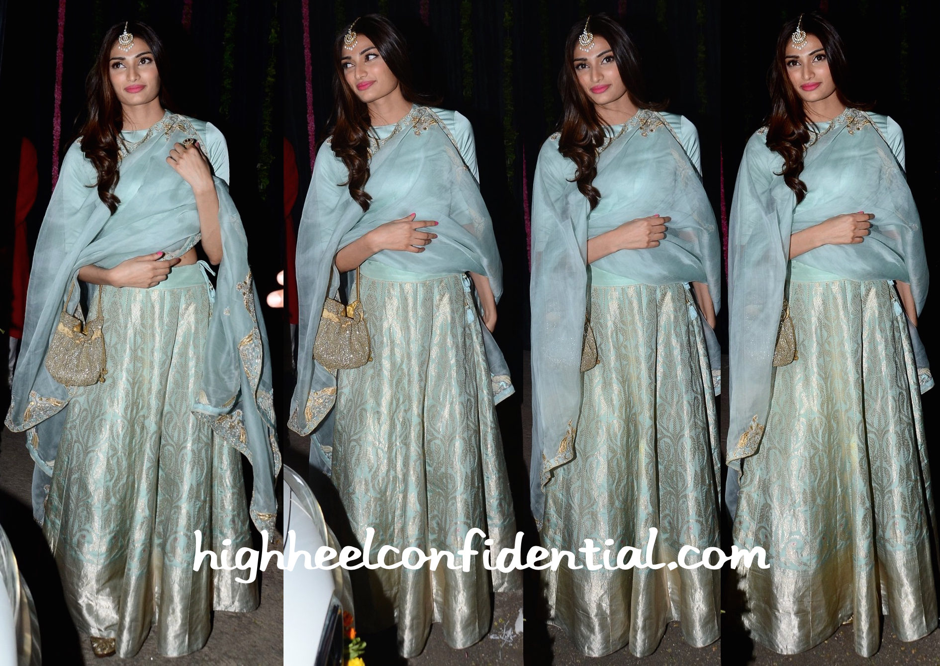 Athiya partook in festivities wearing a pastel Sanjay Garg lehenga. Aside from the mang-teeka and pink lip color, the actor finished out her look with a matching potli and pair of jootis. Not much to fault here; she looked lovely.