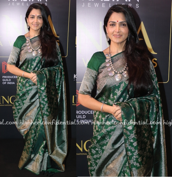 Khushbu attended a press meet for an upcoming Awards event wearing a silver and green Benarasi sari paired with silver jewellery. The sari could’ve been draped just a tad better but she still looked lovely.