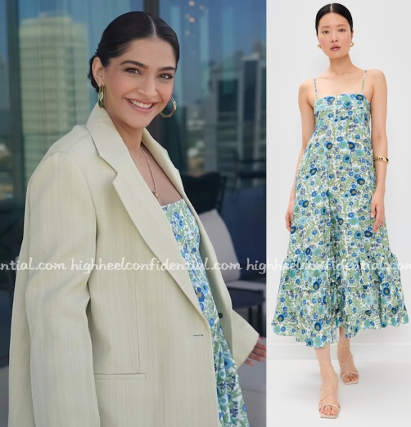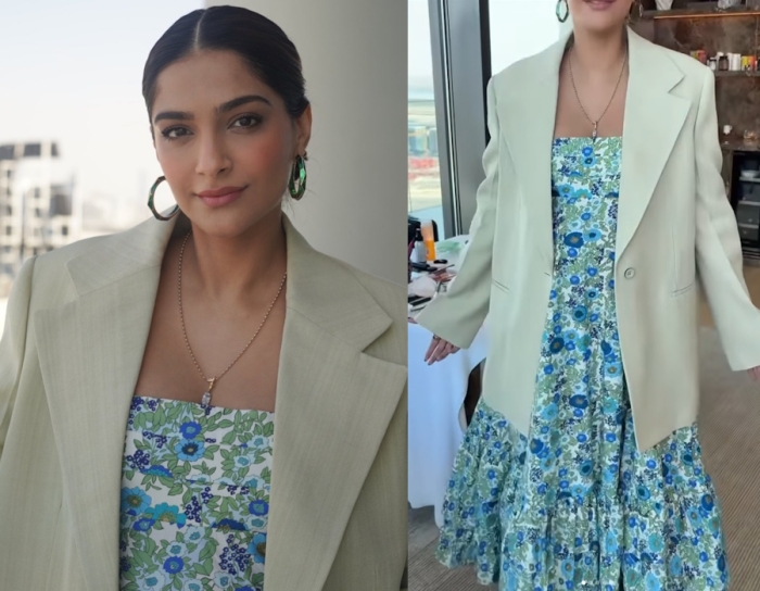Sonam shared some stories on social media getting ready in Dubai and was seen wearing an Alemais midi dress with a beige blazer and green hoops.