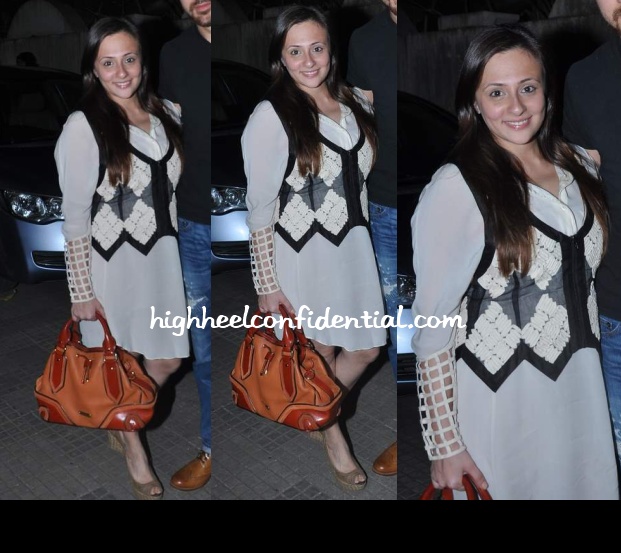 At a private screening of MKBKM, Avantika was spotted wearing a Nupur Kanoi shirt dress (or shirt on the model :P) with a vest also by the designer. Not only were the accessories wrong for the look, the vest doesn’t quite work with the shirt dress either.
