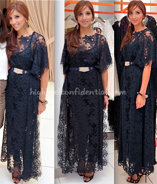 At the launch of her collection in Harvey Nichols, designer Ayesha Depala wore a lace maxi dress and leggings from her own label. A Marni belt cinched in the dress at the waist perfectly and Manolos completed the look. We like.