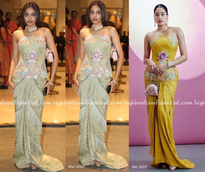 Banita was seen at the Chandhok-Tendulkar wedding wearing an Anamika Khanna corset and fringe skirt set, one that we also saw in a yellow version on Janhvi last year. I checked multiple sources and confirmed that Ms. Sandhu was in fact wearing a beige/creamish version.