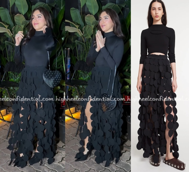 Bhumi was spotted late evening enjoying a night out in an A.W.A.K.E Mode skirt paired with mock-neck full-sleeve top and her Alaïa LeCoeur bag. She wore the whimsical skirt well.
